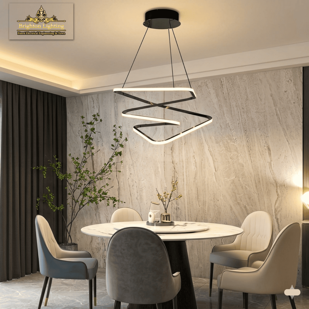 The Quantum Vortex is not just a light fixture; it is a captivating focal point designed for the modern home. Combining sleek, black-finished metal and integrated LED technology, this multi-layered geometric pendant creates a dynamic visual statement. It features three stacked, irregular trapezoid frames that appear to float, creating a continuous, glowing “vortex” of warm, even light. Perfect for illuminating a contemporary dining table or modern living area, this chandelier brings a sense of sophisticated, clean-line elegance to any sophisticated interior. The adjustable suspension allows you to customize the height and presence of the light.