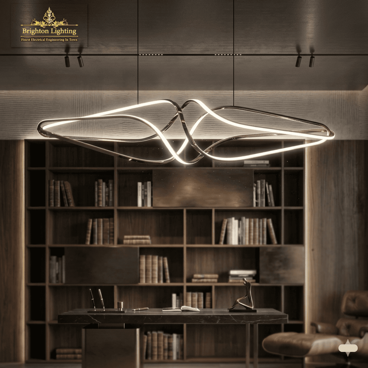 Elevate your home with this stunning contemporary linear LED chandelier. Features a sculptural, interlocking ribbon design with a rich gold finish. Ideal for modern dining rooms, luxury home offices, or entryways. High-brightness, dimmable LED technology. Discover the Aethel Interlocking Linear Pendant. A sophisticated, sculptural gold LED fixture that provides powerful, evenly distributed light. Its unique twisted design makes it perfect for architectural spaces, boardrooms, or expansive tables. Energy-efficient, integrated LED.