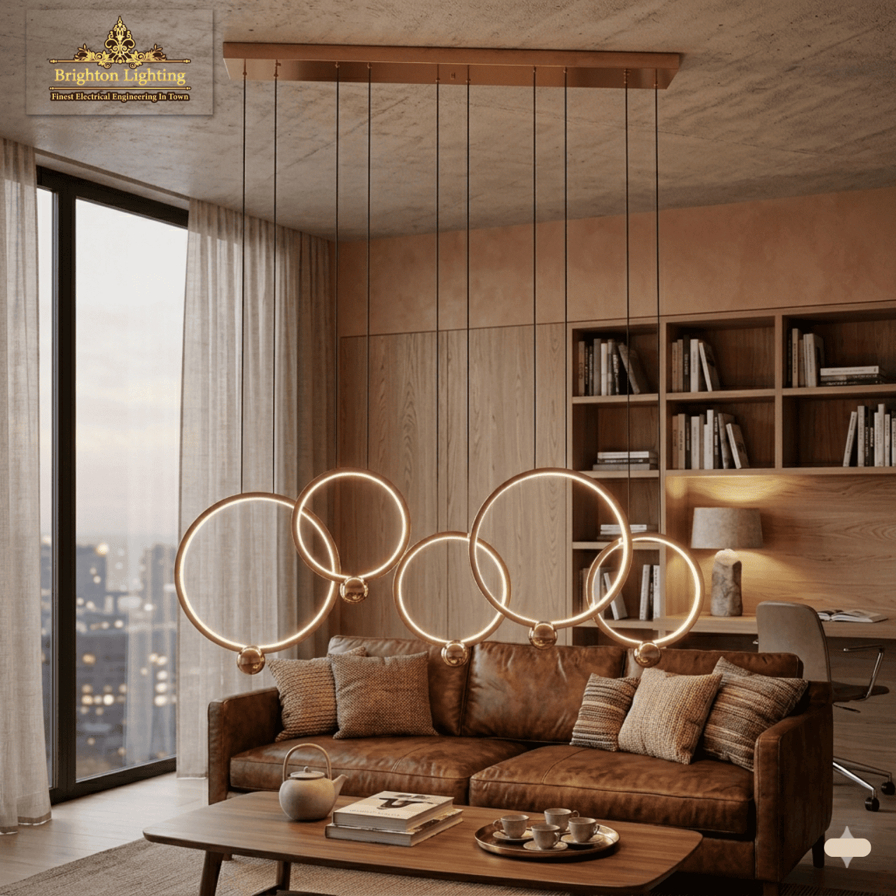 Elevate your space with our stunning Rose Gold Multi-Ring LED Pendant. Featuring five interlocking glowing hoops in a copper finish, this contemporary chandelier combines artistic flair with energy-efficient lighting. Perfect for dining rooms and luxury lounges. Make a statement with this abstract geometric LED pendant light. With a unique design of rose gold rings and matching spheres, this fixture brings a sophisticated, mid-century modern vibe to any home office or master bedroom.