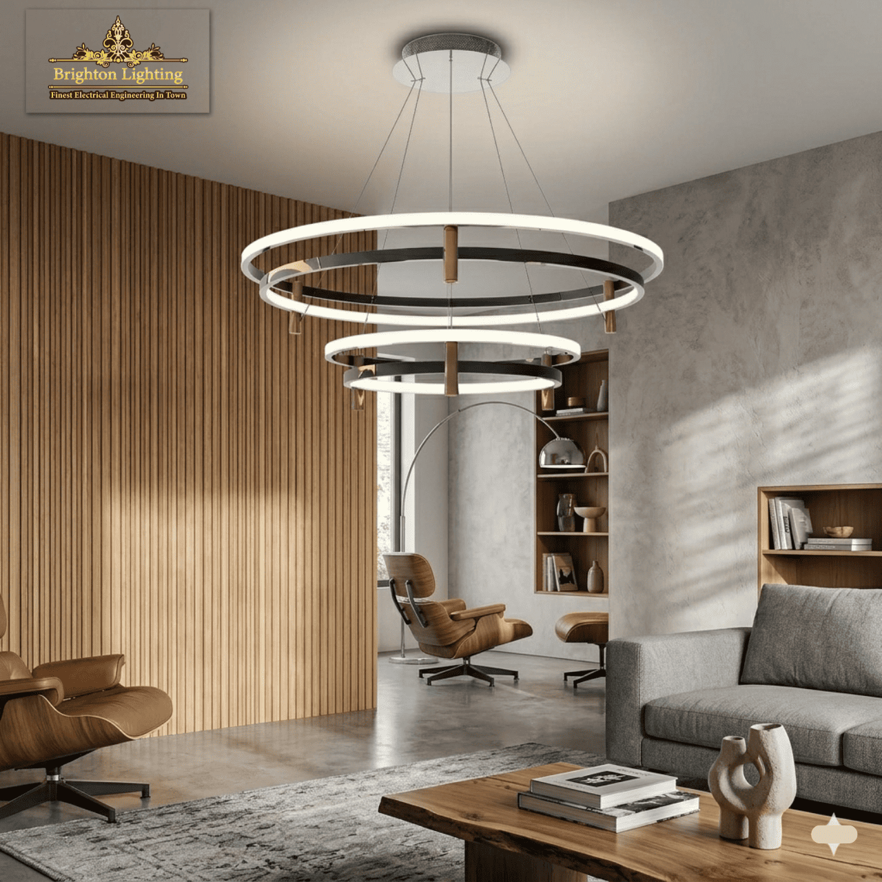 Elevate your space with this stunning 2-tier LED ring chandelier. Black and copper finish. Energy-efficient, modern, and dimmable. Perfect for any contemporary home.