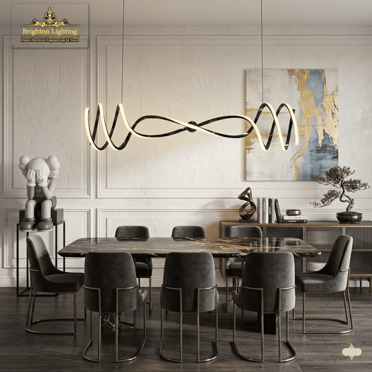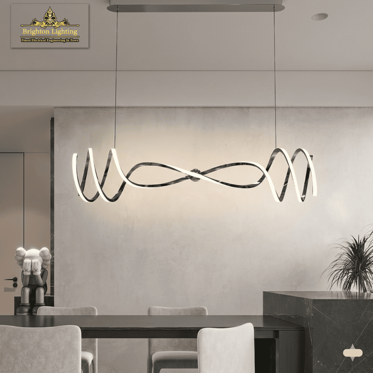 Redefine your space with this stunning, wave-shaped LED pendant. Featuring a continuous, swirling ribbon design, it creates a sense of dynamic movement and infinite flow. The contrasting black and integrated white light strips offer a contemporary, sculptural look perfect for modern dining rooms or open-concept spaces.