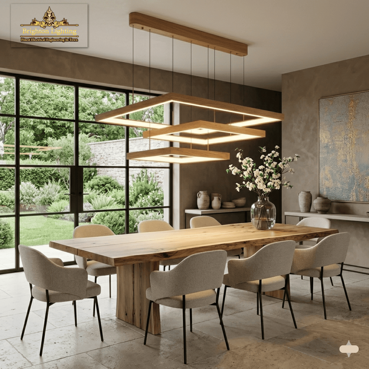 Elevate your space with this modern 3-tier rectangular LED pendant light. Featuring a natural wood finish and adjustable height, it provides a soft warm glow perfect for minimalist living rooms and dining areas.