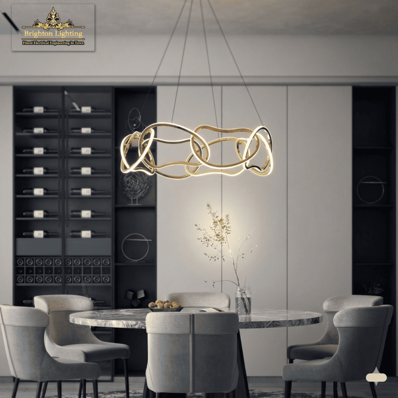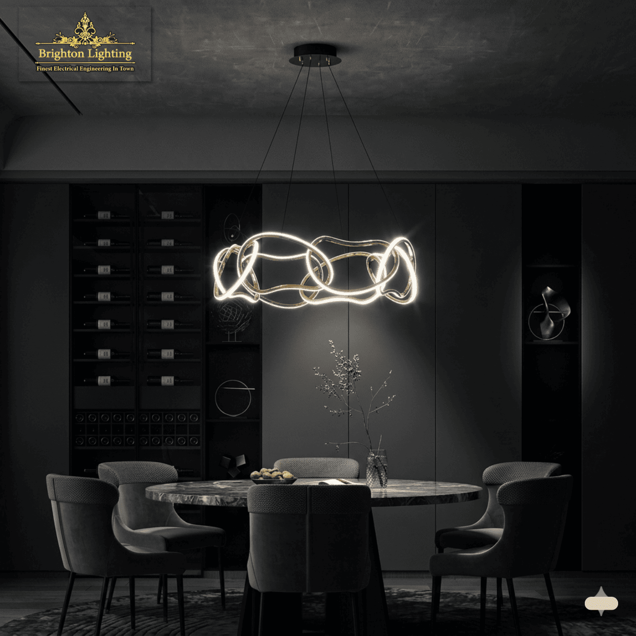 Illuminate your dining space with the Aura. A stunning dark modern dining room chandelier featuring sculptural, interwoven gold LED rings that glow brightly as a central masterpiece. Create a high-contrast, moody cinematic atmosphere. Luxury lighting at its finest. This modern, sculptural gold LED chandelier defines space. Designed for dark and charcoal modern dining rooms, it casts dramatic shadows and spotlight illumination. Featuring bright LED glow and high-contrast moody cinematic lighting perfect for luxury interiors with reflective surfaces.