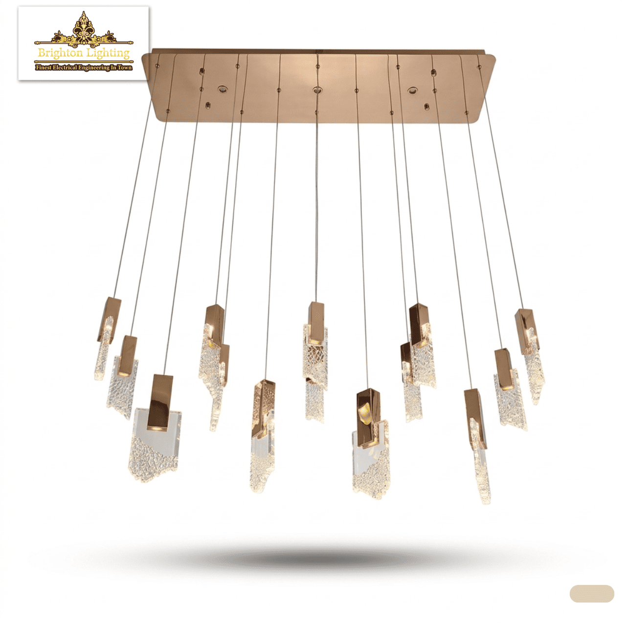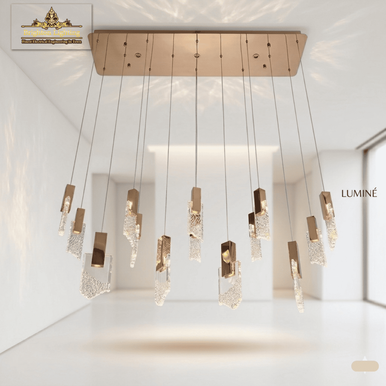 Artisanal Textured Crystal: Features twelve hand-cut crystal diffusers with unique, complex internal textures for a unique look and soft light diffusion.