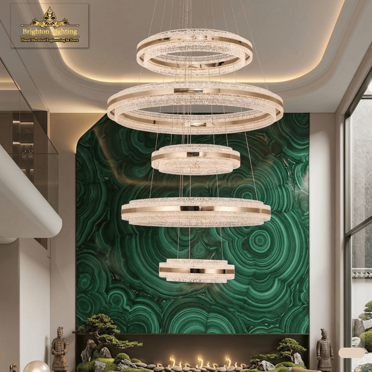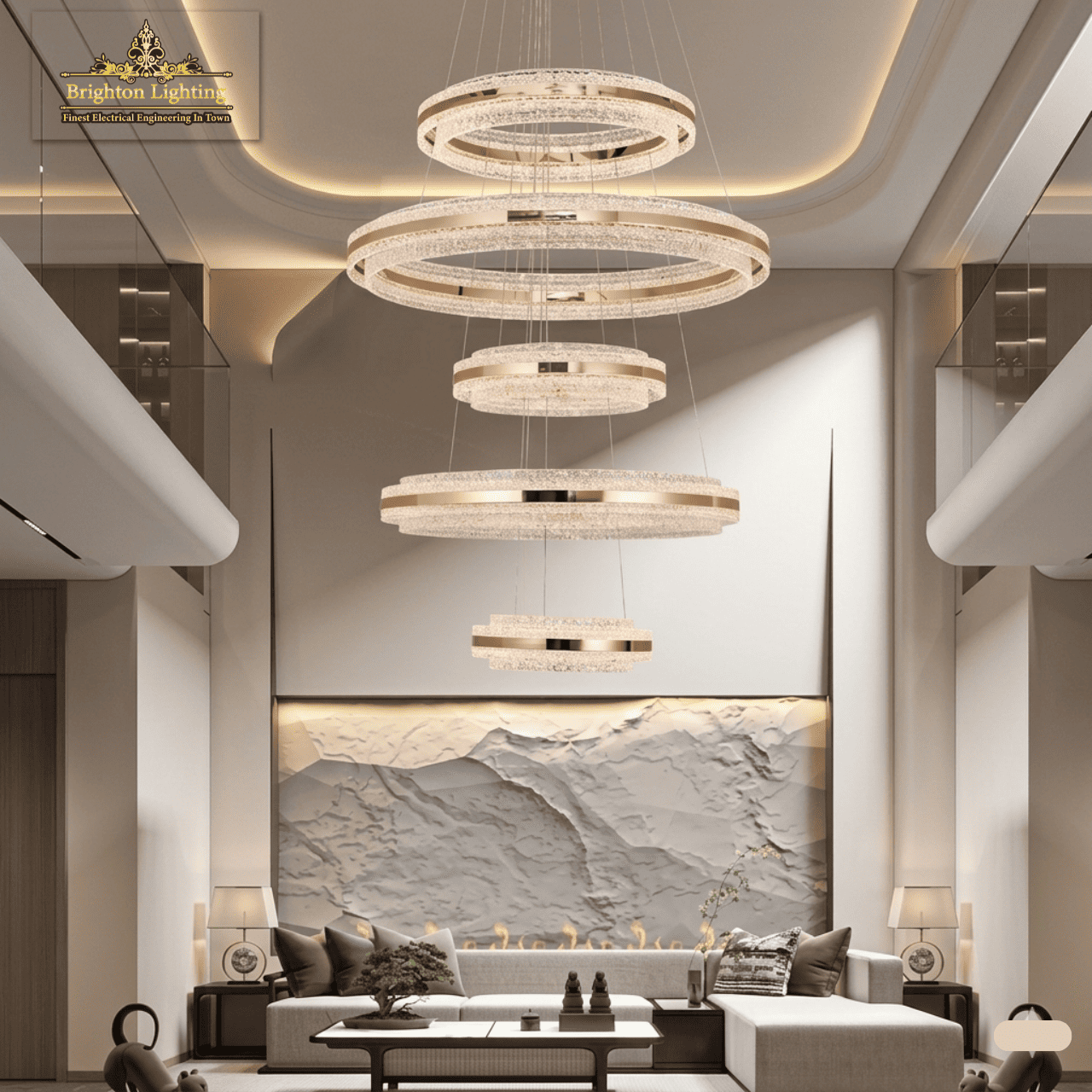 Transform your space with this captivating five-tier modern LED ring chandelier. This masterpiece features stacked crystal-encrusted rings with glamorous gold accents, radiating a warm, inviting glow that elevates any large room. Ideal for high ceilings, double-height entryways, or as a statement piece over a sophisticated dining area, its blend of luxe materials and minimalist design makes it a versatile lighting choice for contemporary, transitional, and classic interiors. Crafted with energy-efficient LED technology, this crystal pendant light is not just a fixture, but a sculpture that illuminates with brilliance. Discover the perfect fusion of functional lighting and exquisite artistry for your luxurious home.