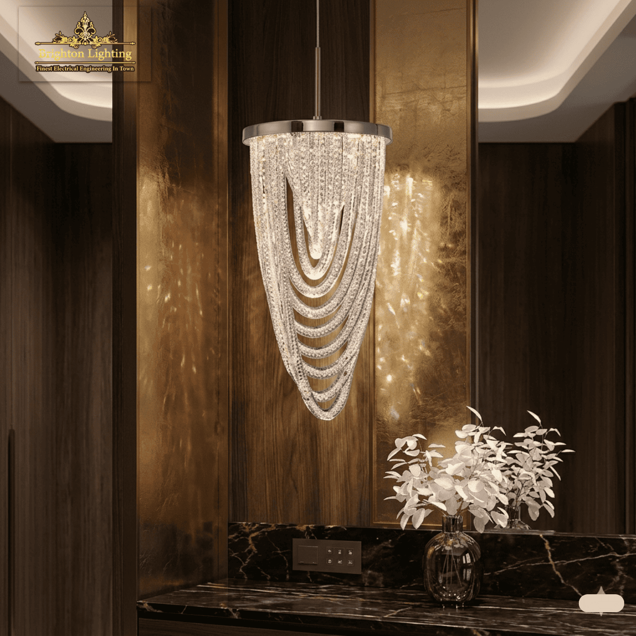 Dramatic Design: A captivating blend of contemporary style and classic luxury, featuring a unique multitiered, “draped” loop crystal design that catches and refracts light brilliantly.