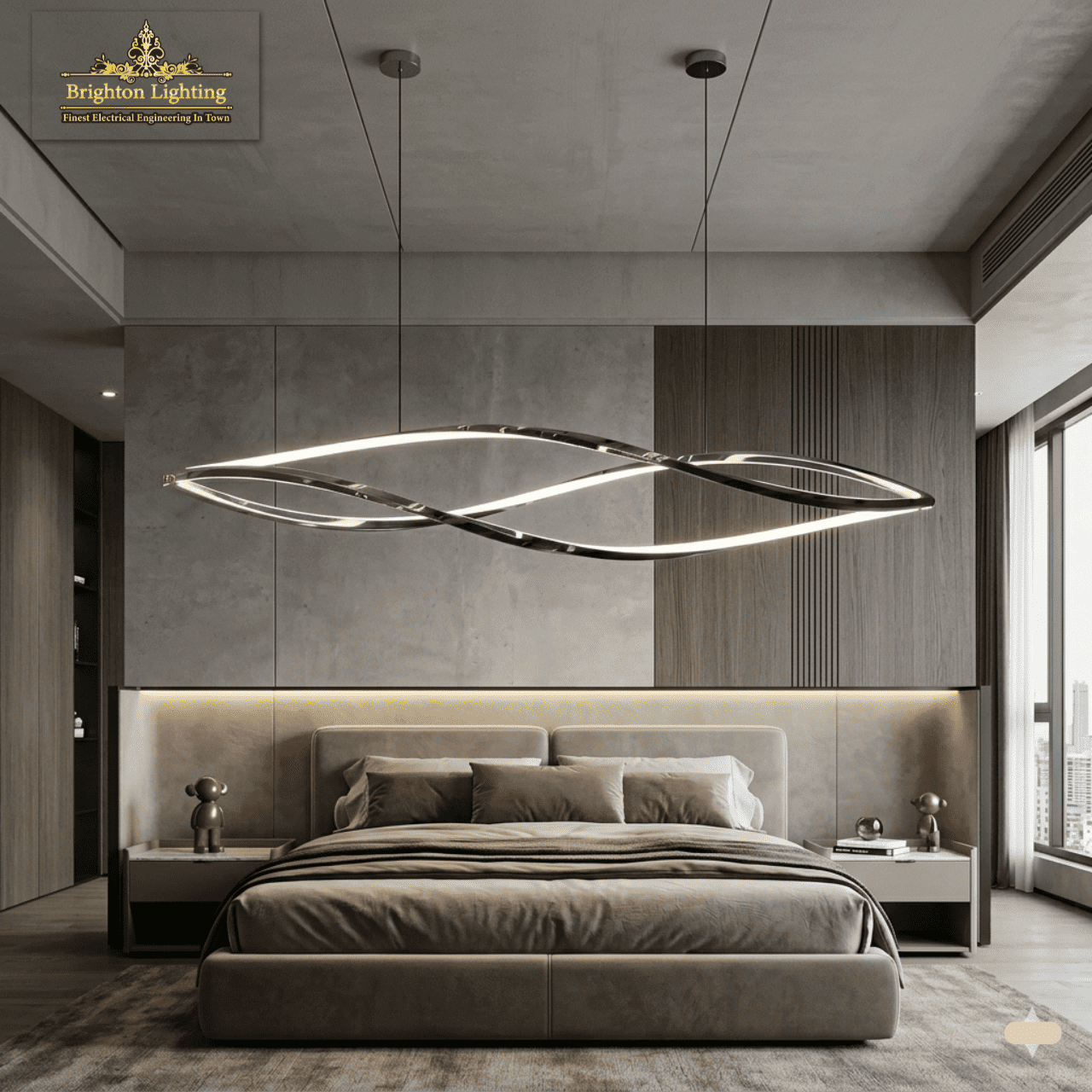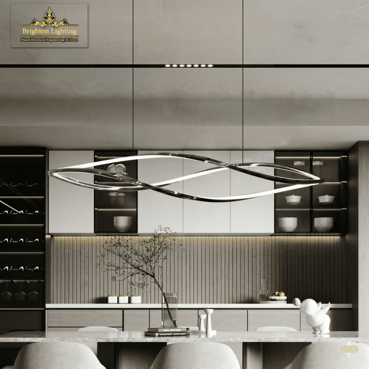 Elevate your space with this stunning sculptural infinity loop LED pendant light. Featuring a flowing metal ribbon design with an integrated soft white glow, it’s the perfect statement piece for a modern dining area. ultra realistic architectural photography.