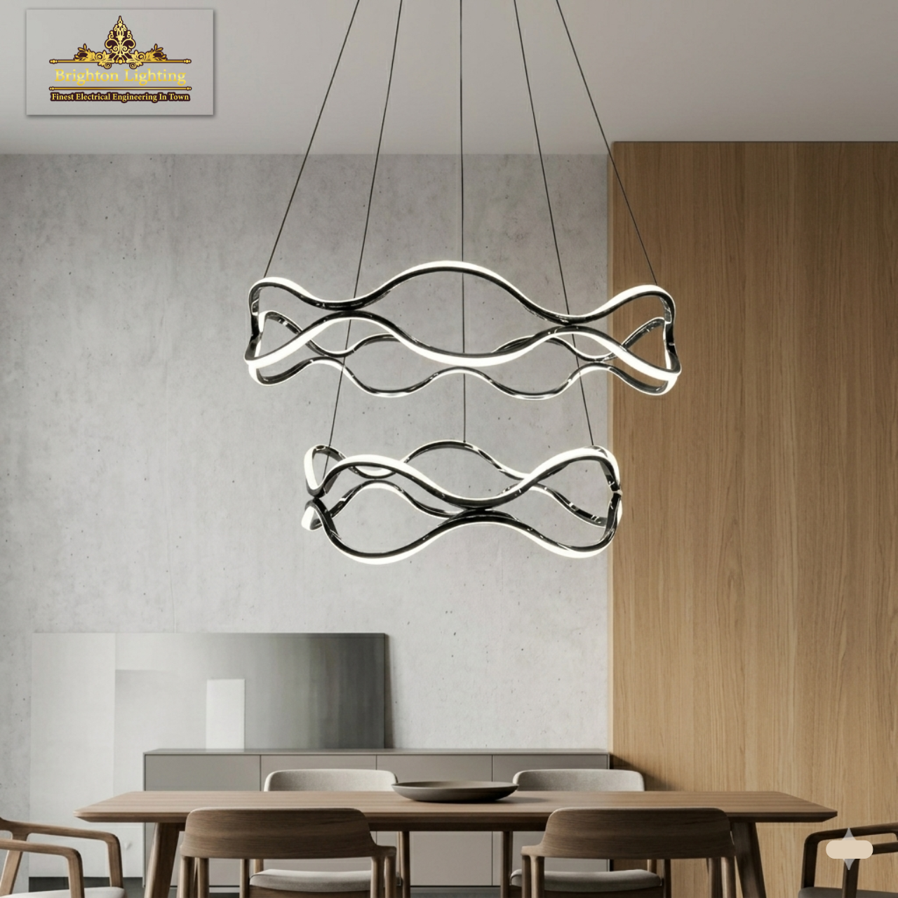 Professional-grade stainless steel LED pendant in a sleek gunmetal finish. This two-tier 128W, 3CCT-equipped wavy chandelier is designed for high-end residential and commercial interiors. Our dimmable wavy LED pendant offers 3CCT color changing and a unique multi-tiered ribbon aesthetic. Upgrade to brilliant, flexible light today.